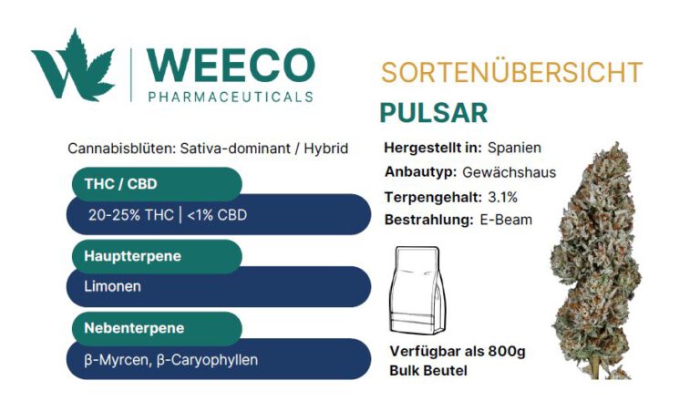Die Weeco Pharma GmbH erweitert ihr Sortiment um die neue Cannabissorte Pulsar 25/1 – eine sativa-dominante Blüte mit 25 % THC und < 1 % CBD. Die Sorte überzeugt durch ihr fruchtig-zitrisches Aroma und eine aktivierende Wirkung, ideal für die Tagesanwendung. Pulsar 25/1 wird unter EU-GMP-Standards produziert und ist ab sofort über ausgewählte Apotheken verfügbar.